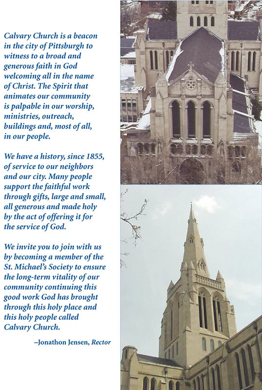 Anyone who has made a provision of support for Calvary Church as part of their estate plans and has notified Calvary Church of that intention in writing is eligible for membership in the St. Michael’s Society at Calvary